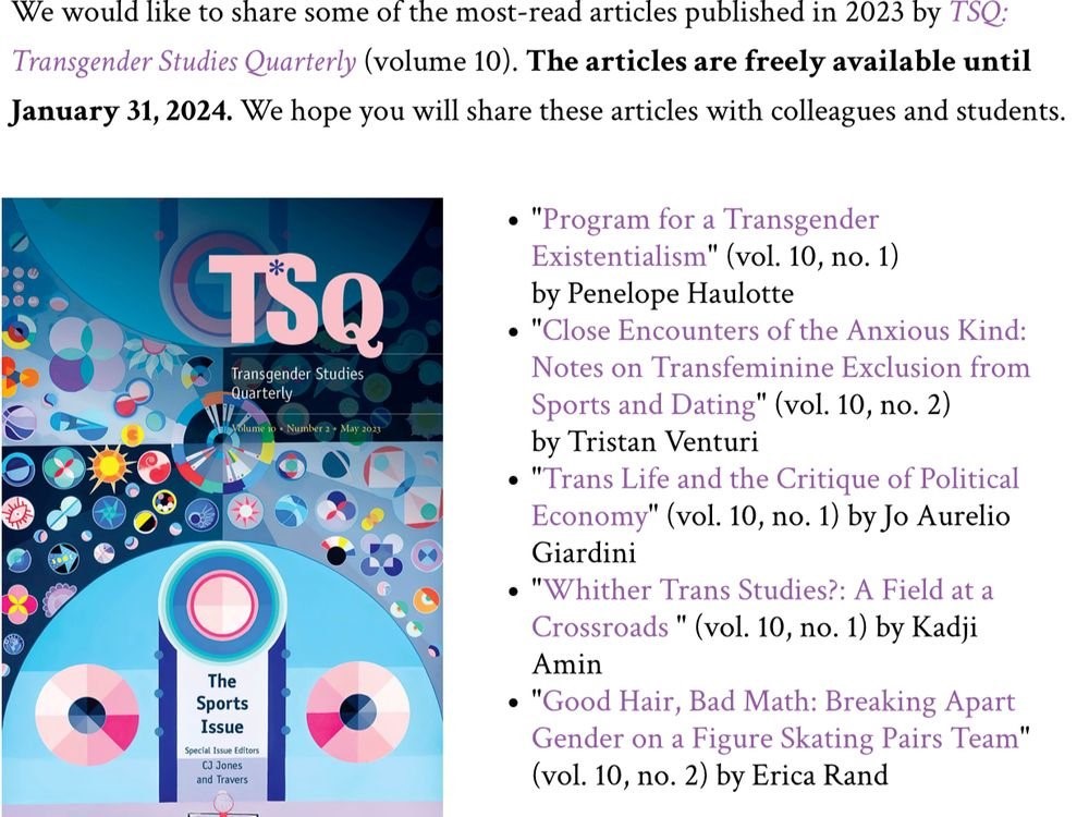 - My “Program for a Transgender Existentialism” was one of the most-read articles in TSQ for the year 2023. I am especially proud of this accomplishment because TSQ was the first journal by trans people specifically devoted to the exploration of trans life and experience.